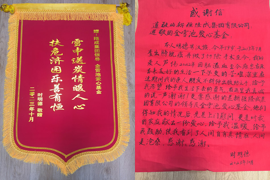 時(shí)明德夫婦所居住的水塔山街道新居巷社區(qū)主任及包戶干部一同參加現(xiàn)場(chǎng)捐贈(zèng),并代表社區(qū)對(duì)隆成集團(tuán)“金雪馳愛(ài)心基金”表達(dá)了感謝?!敖鹧Y愛(ài)心基金”是隆成集團(tuán)對(duì)社會(huì)的感恩回報(bào),攜帶著集團(tuán)的溫暖,融化了時(shí)明德夫婦的心。二人接受捐贈(zèng)時(shí)非常激動(dòng),一直不停在說(shuō),“這真的是雪中送炭”,“不是親人,勝似親人”。時(shí)明德本人更是制作了一面錦旗,并手寫了一封感謝信,信中滿是感謝二字。他表示,此次援助如雪中送炭,予以了生活下去的勇氣。
