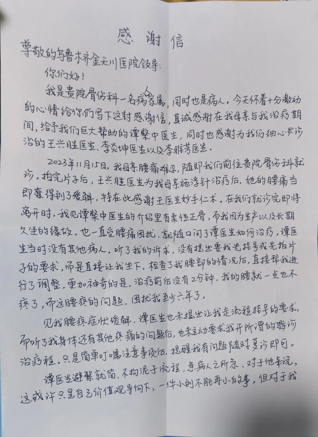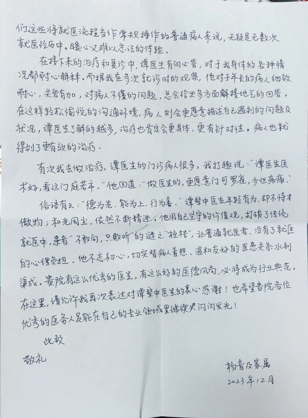 對(duì)于譚醫(yī)生來說,這是一件小事,但對(duì)于楊女士來說,無疑是無數(shù)次就醫(yī)經(jīng)歷中暖心又難以忘記的體驗(yàn),楊女士于2023年12月28日將錦旗送到了譚醫(yī)生的手中,并親手將表?yè)P(yáng)信送到了醫(yī)院辦公室,與楊女士溝通后烏魯木齊金天川醫(yī)院領(lǐng)導(dǎo)班子高度重視、積極籌備,為此次受到患者表?yè)P(yáng)的骨傷科醫(yī)師們頒發(fā)了紅包,以資鼓勵(lì);對(duì)他們“以患者為中心”的服務(wù)理念提出表?yè)P(yáng),周少云院長(zhǎng)希望受表獎(jiǎng)的同事要不驕不躁、繼續(xù)努力,并且請(qǐng)全院醫(yī)護(hù)人員都能時(shí)刻做好優(yōu)質(zhì)服務(wù)并銘記:每一次患者的微笑、每一次患者的感謝,都是對(duì)我們工作的最高認(rèn)可。都是將患者放在第一位的回報(bào)。
